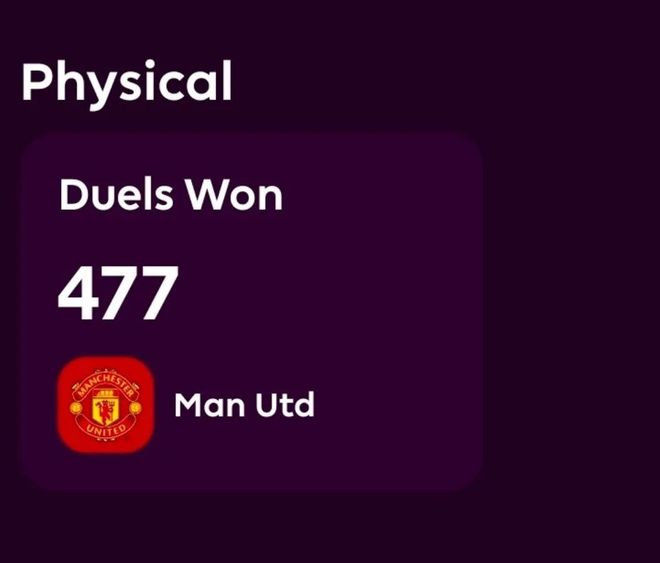 曼联本赛季在英超联赛中一共赢得477次对抗,次其他任何球队都多。